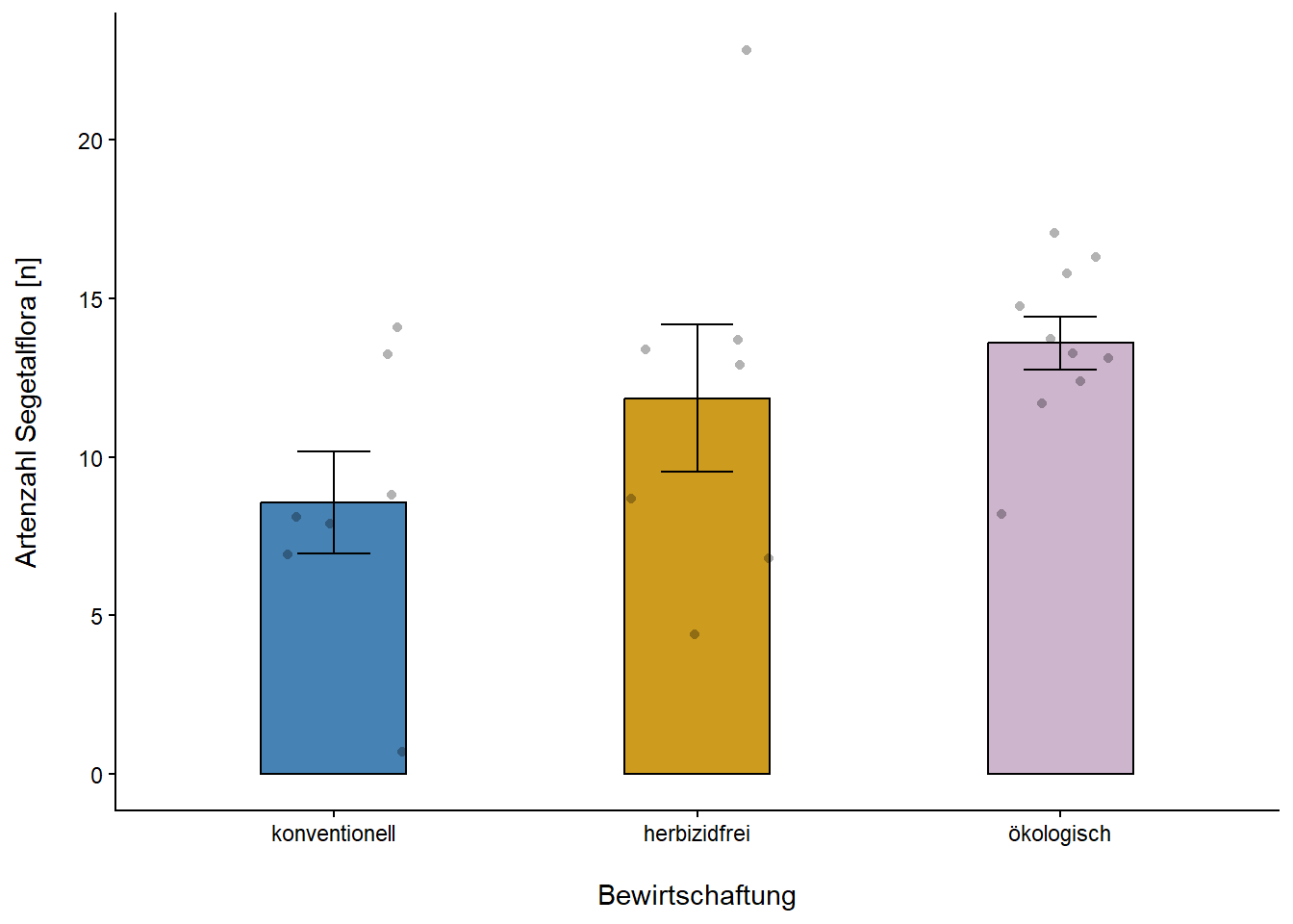 Auf den ökologisch und herbizidfrei bewirtschafteten Mais-Äckern waren durchschnittlich die Hälfte bzw. ein Drittel mehr Arten (14 vs. 12 Taxa) als auf konventionellen Flächen (9 Taxa) nachzuweisen (Abb. 2).