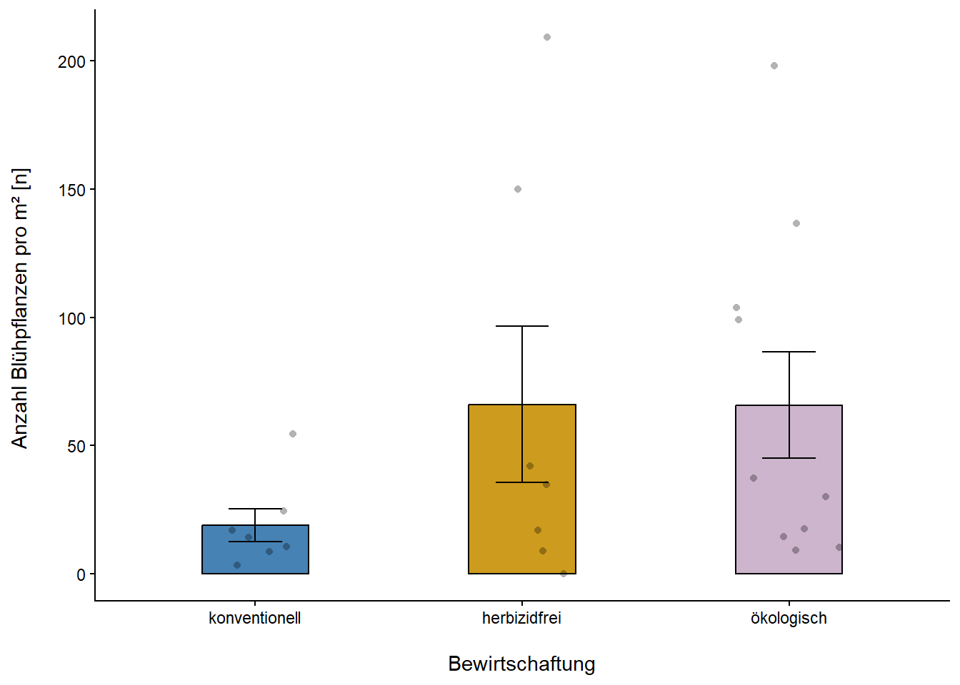 Bezüglich des potentiellen Blütenangebots zeigt sich im Körnerleguminosenanbau ein klarer Trend: Hier ist im konventionellen Landbau mit 19 Blütenpflanzen pro m² das geringste Blütenangebot vorhanden während dieses in der herbizidfreien Variante und auf ökologisch bewirtschafteten Feldern mit 66 Blütenpflanzen pro m² ca. 3,5 Mal höher war (Abb. 3).
