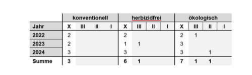 Bezüglich des Naturwertes von herbizidfreien und ökologisch bewirtschafteten Mais-Äckern zeigte sich im FINKA-Projekt ein fast einheitliches Bild: Nur 1 bzw. 2 Flächen wiesen einen Naturwert (dabei handelt es sich um die geringste III bzw. mittlere Stufe III)) auf. Für die Mehrzahl der Äcker konnte kein Naturwert (X) zugeordnet werden. Auf den konventionell bewirtschafteten Mais-Äckern war über all die Jahre auf keiner Fläche ein Naturwert nachweisbar (Tab. 1).